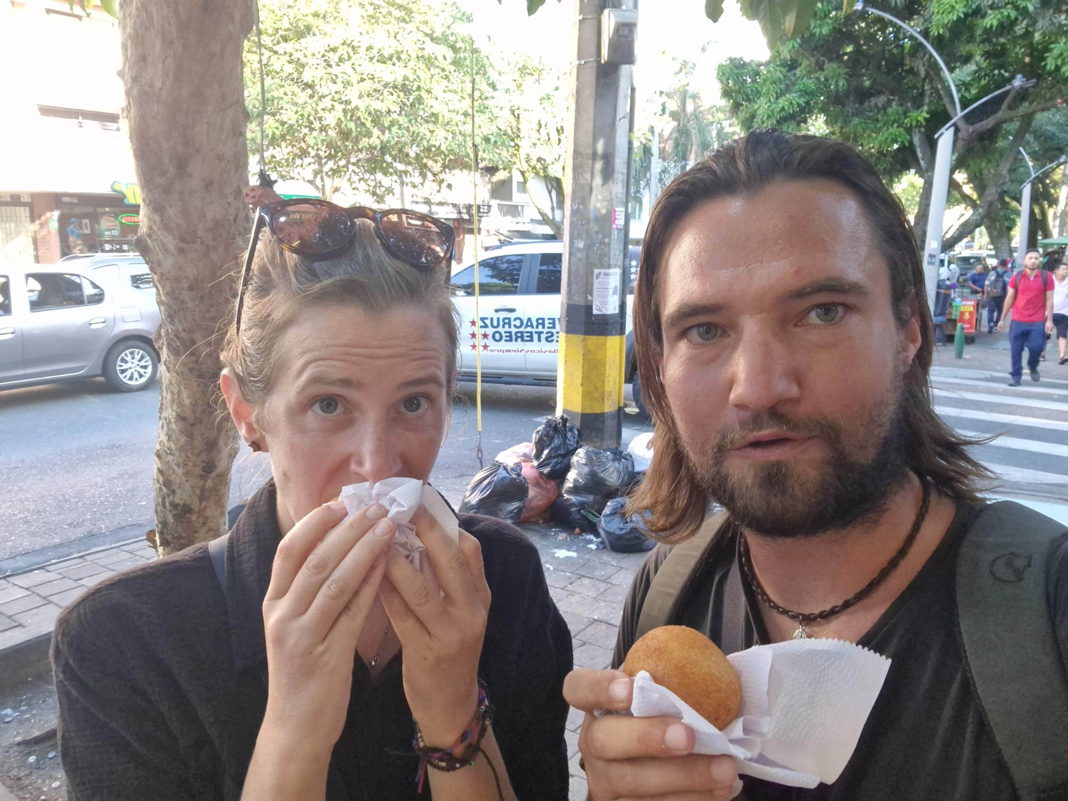 Weiter geht unsere Reise Richtung Medellin und beim nächsten Stop können wir zum Glück nur Touristenscharen beobachten. Wir schlafen an der Lagune und besteigen den berühmten Peñol Felsen. Hunderte Stufen rauf für eine gute Aussicht und oben gibt’s ein MaracuMango: Michelada mit Maracuya und Mangostücken. So gestärkt geht’s wieder runter und im Dörfchen finden wir ein cooles Restaurant, dass Gerichte aus dem Amazonas anbietet. Dort kaufen wir noch zwei Coca-Limonaden und verabreden uns mit den Eltern von einem guten Freund den wir im Zug von Toronto nach Vancouver kennen gelernt haben. Zufälligerweise haben sie morgen Zeit und wir freuen uns extrem sie zu sehen. Auf ihrer Terrasse hat man eine wunderschöne Aussicht und sie zeigen uns ganz viele neue, einheimische und leckere Früchte. Beim Abschied sagen sie uns noch welche Strassen am besten nach Medellin reinführen und wünschen uns weiterhin eine gute Reise.